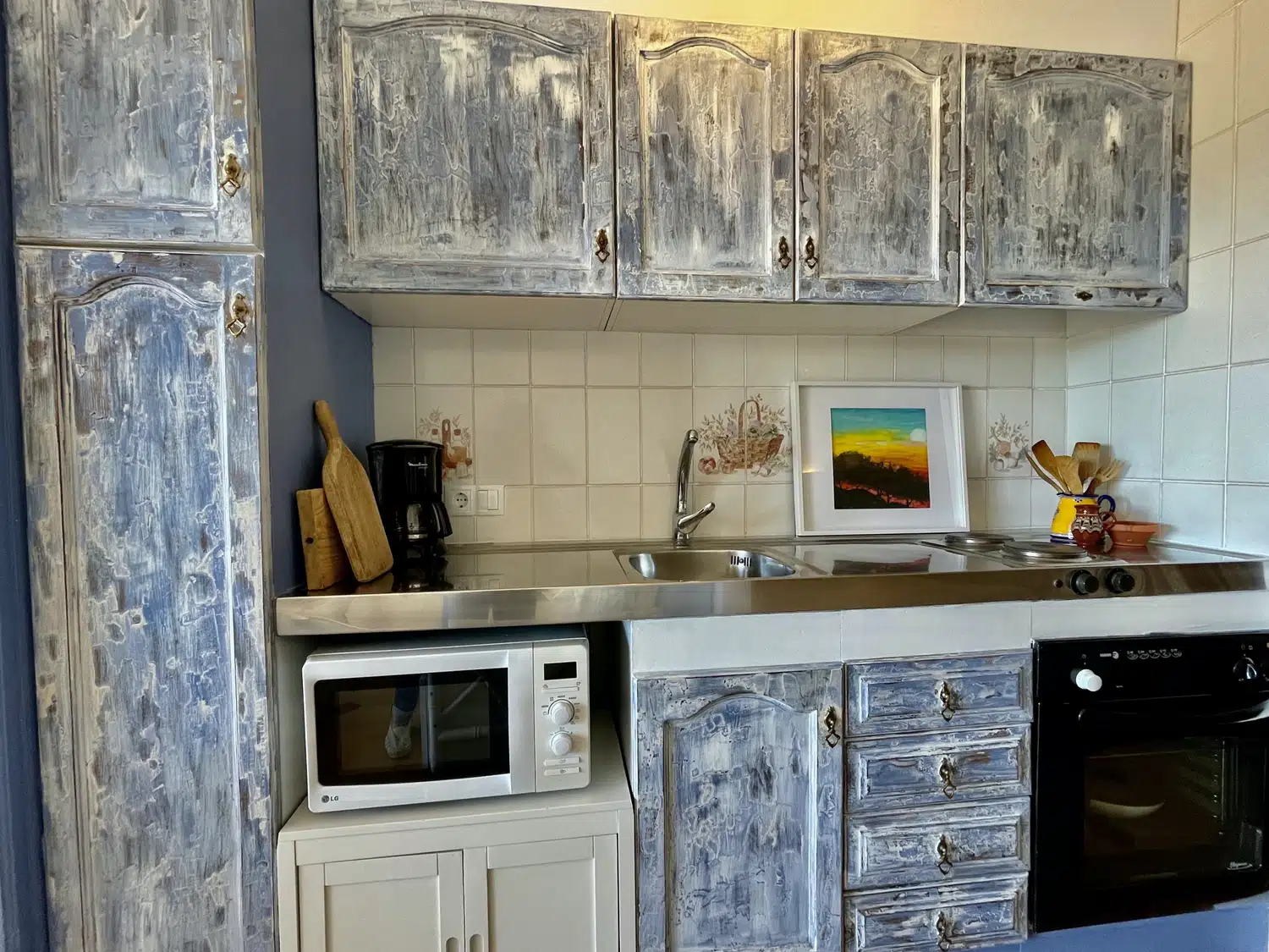 En la cocina americana eléctrica, descubra todo lo imprescindible para sus necesidades culinarias, incluyendo frigorífico, microondas, horno, congelador, lavadora, vajilla/cubertería, utensilios de cocina, cafetera, tostadora y exprimidor.