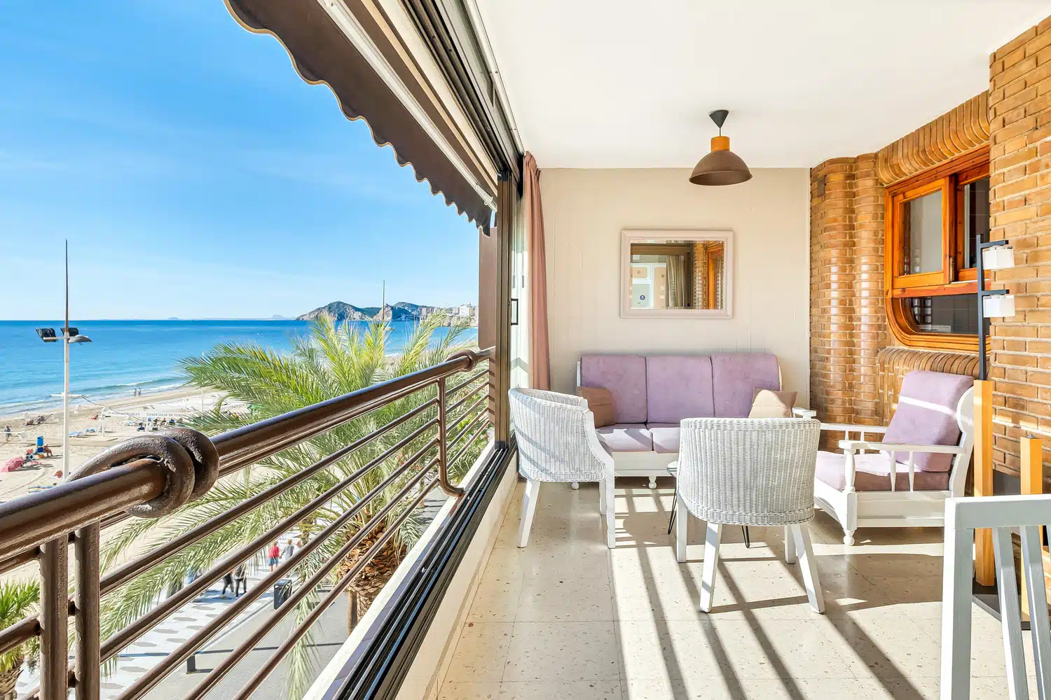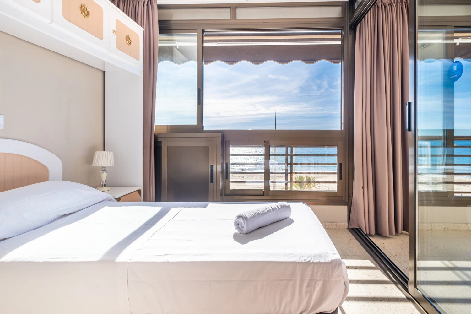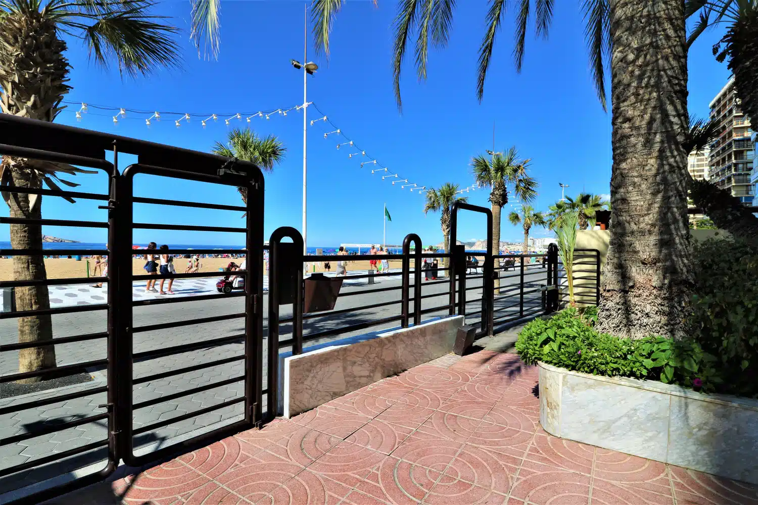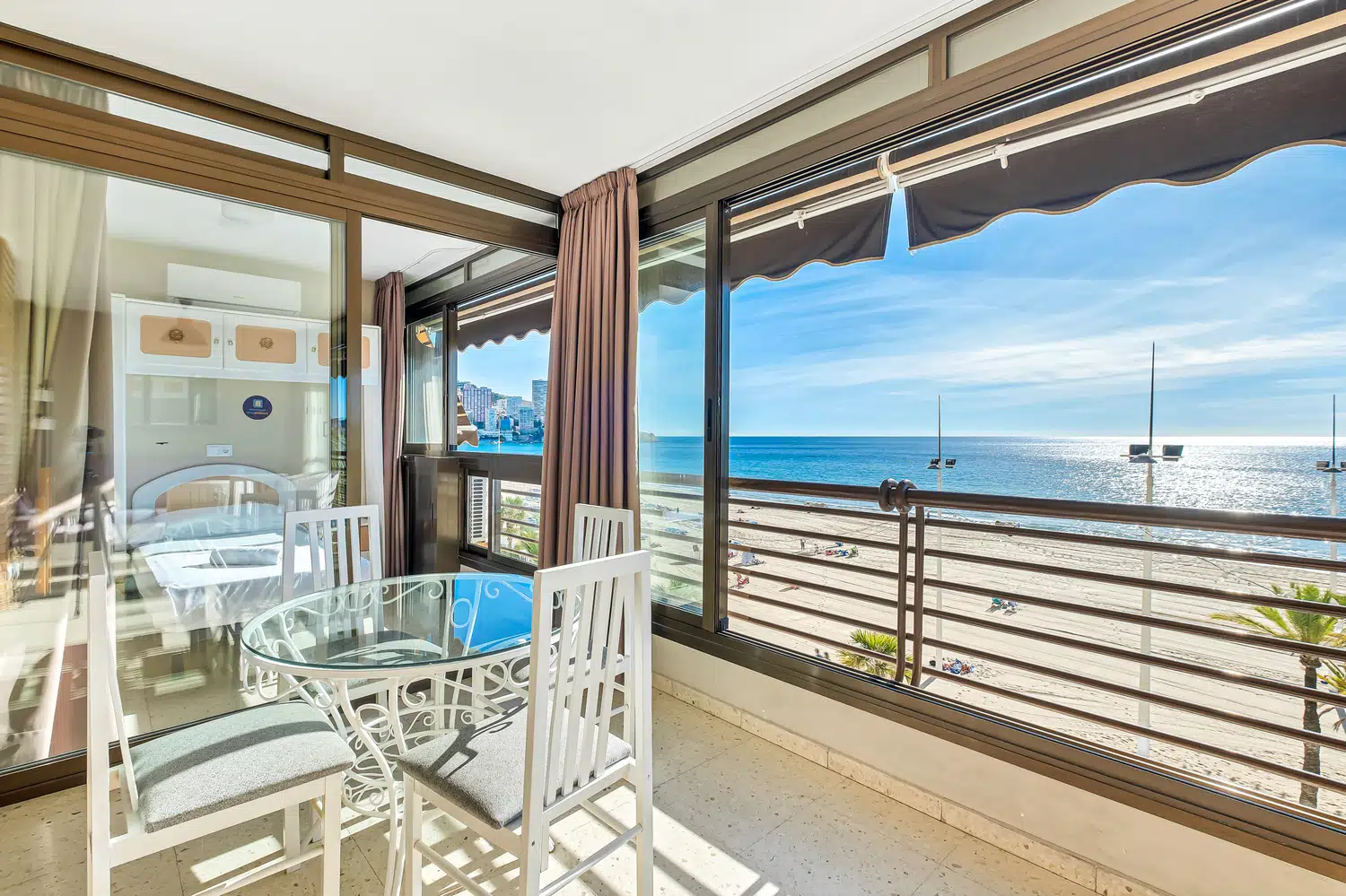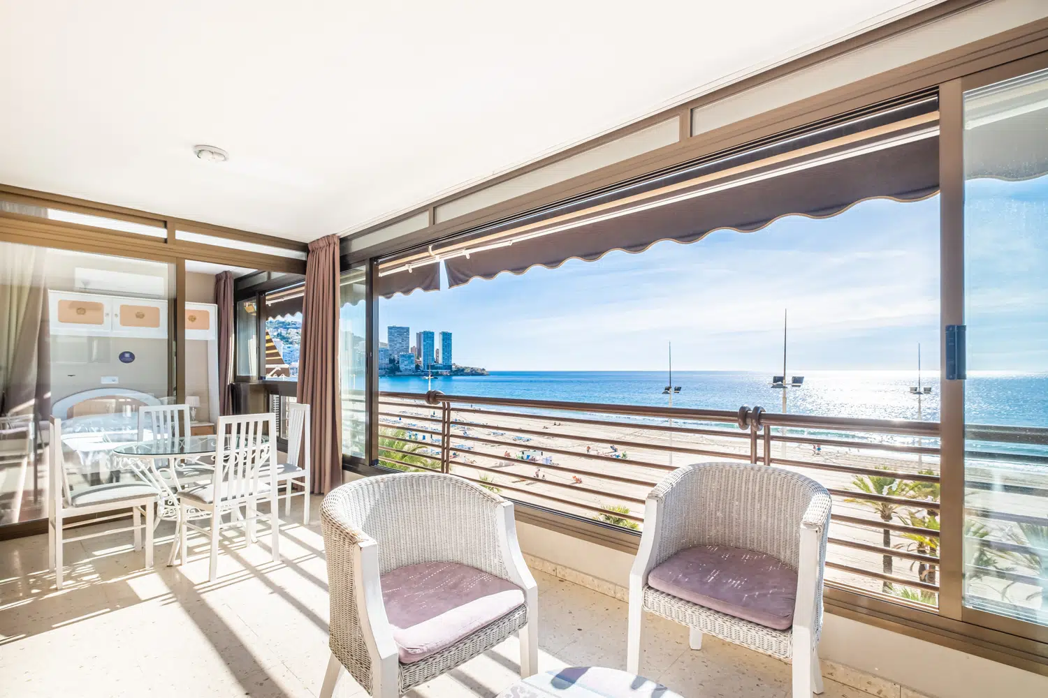 Apartamento en primera línea de playa Levante, Benidorm, con acceso directo a la playa desde el edificio. Posee 2 dormitorios (1+1) y capacidad para 5 personas.
