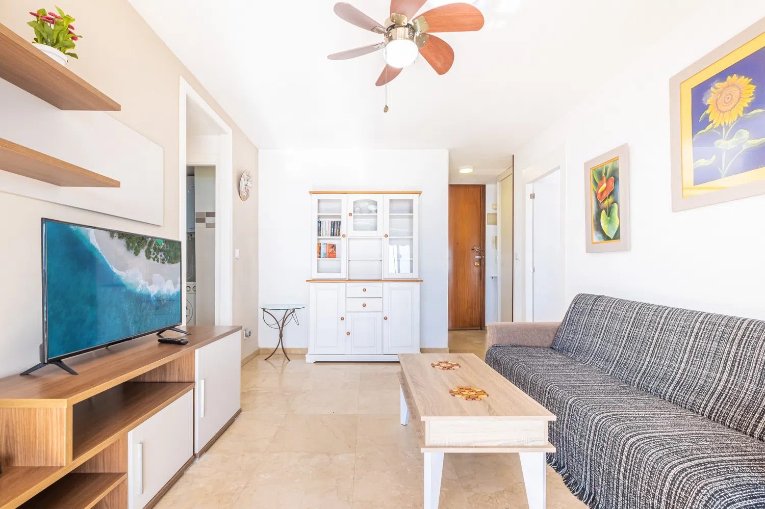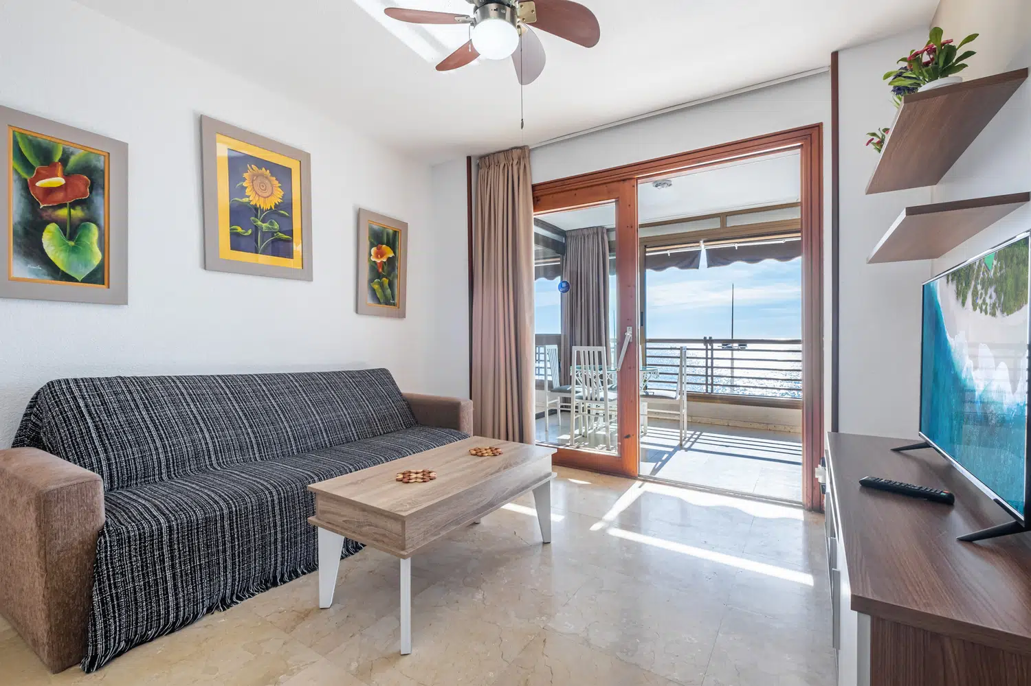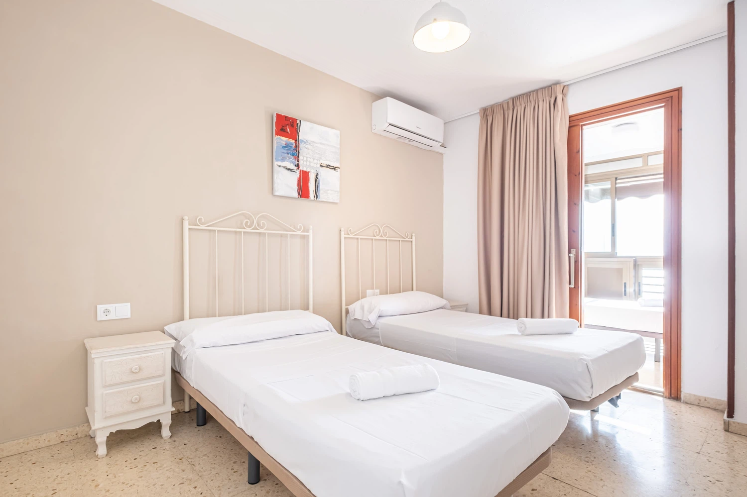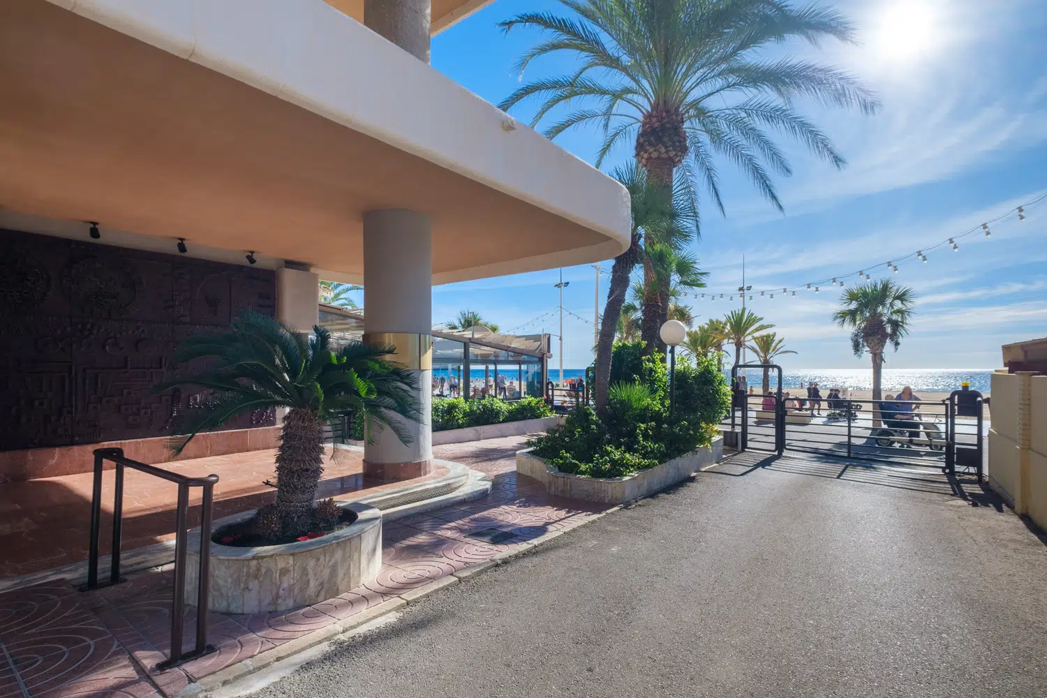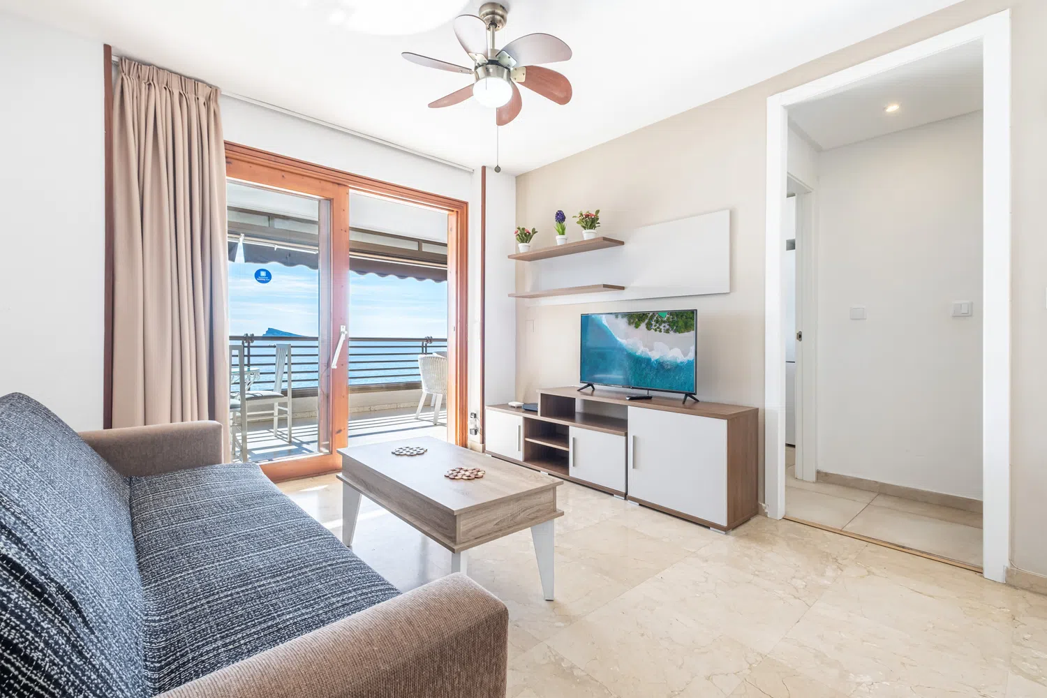 Apartamento en primera línea de playa Levante, Benidorm, con acceso directo a la playa desde el edificio. Posee 2 dormitorios (1+1) y capacidad para 5 personas.