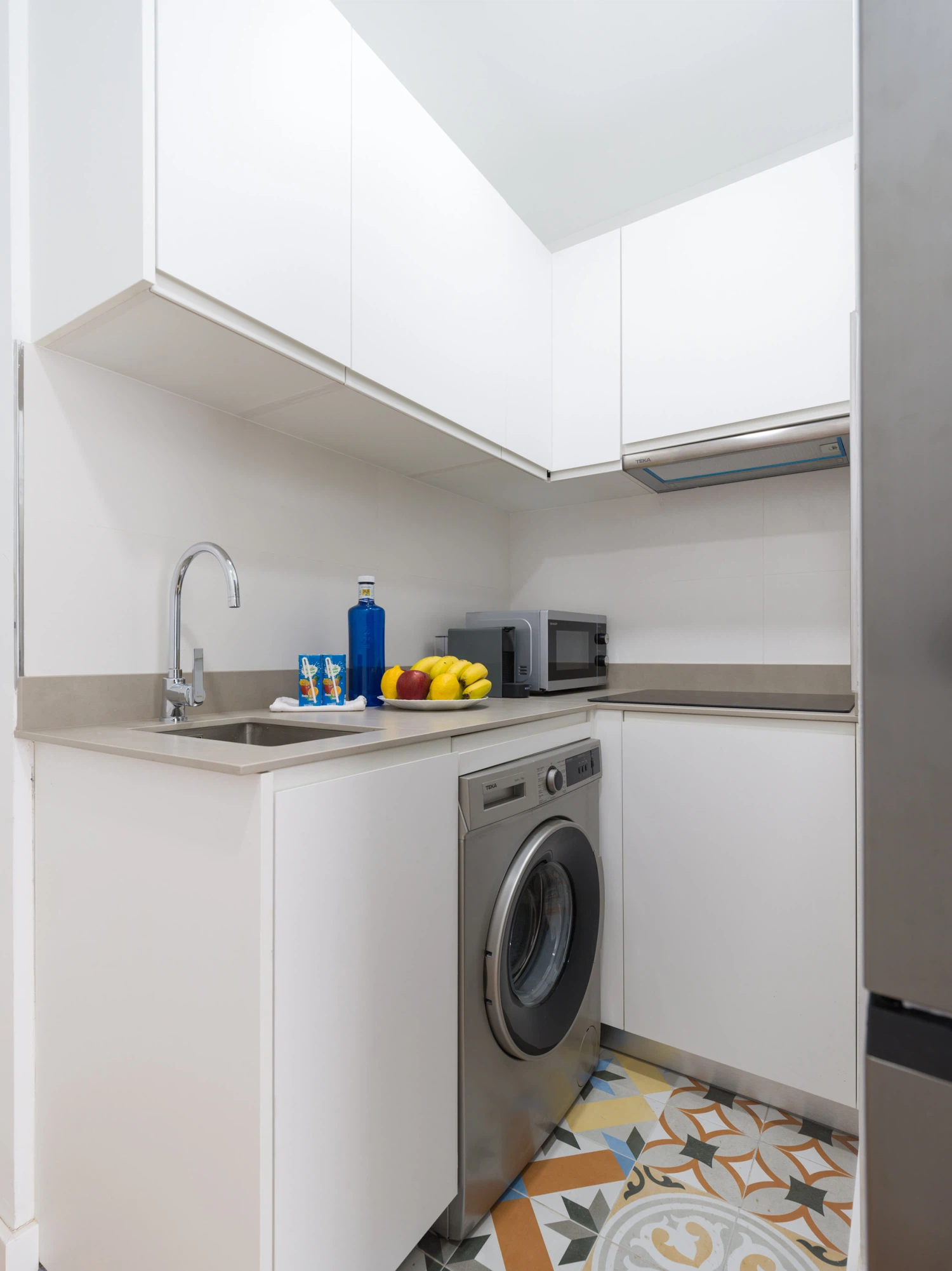 La cocina americana, de vitrocerámica, está equipada con nevera, microondas, lavadora, vajilla/cubertería, utensilios/cocina, cafetera y hervidor de agua.