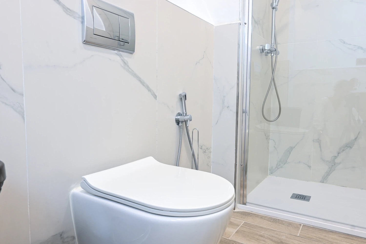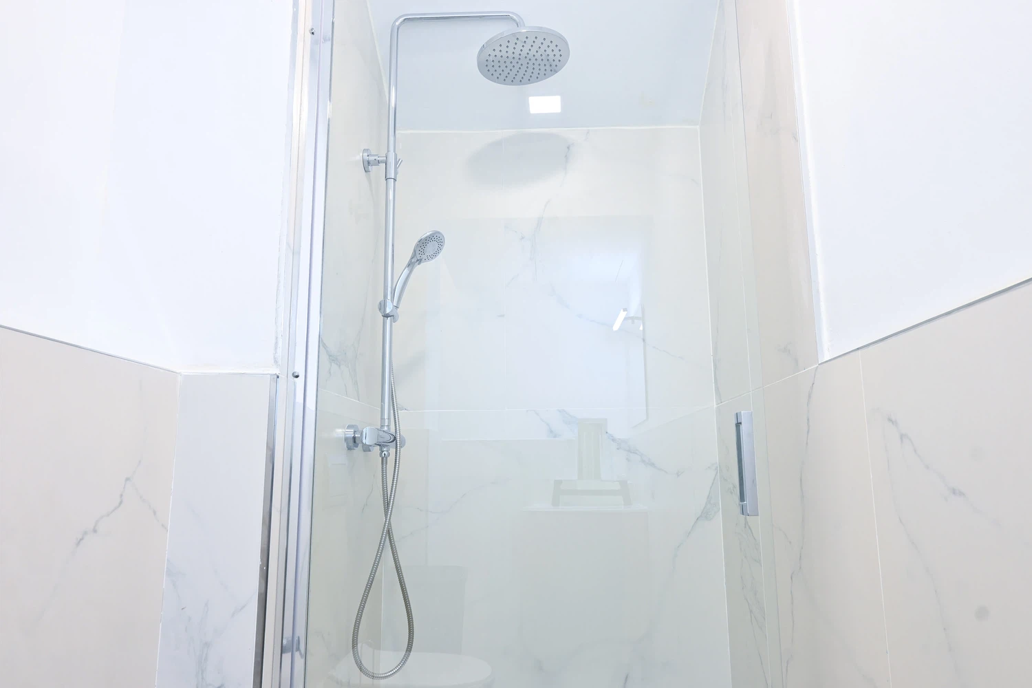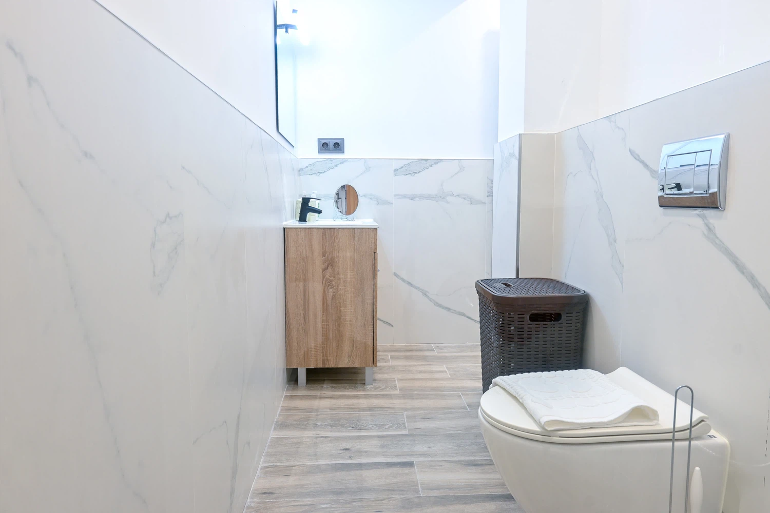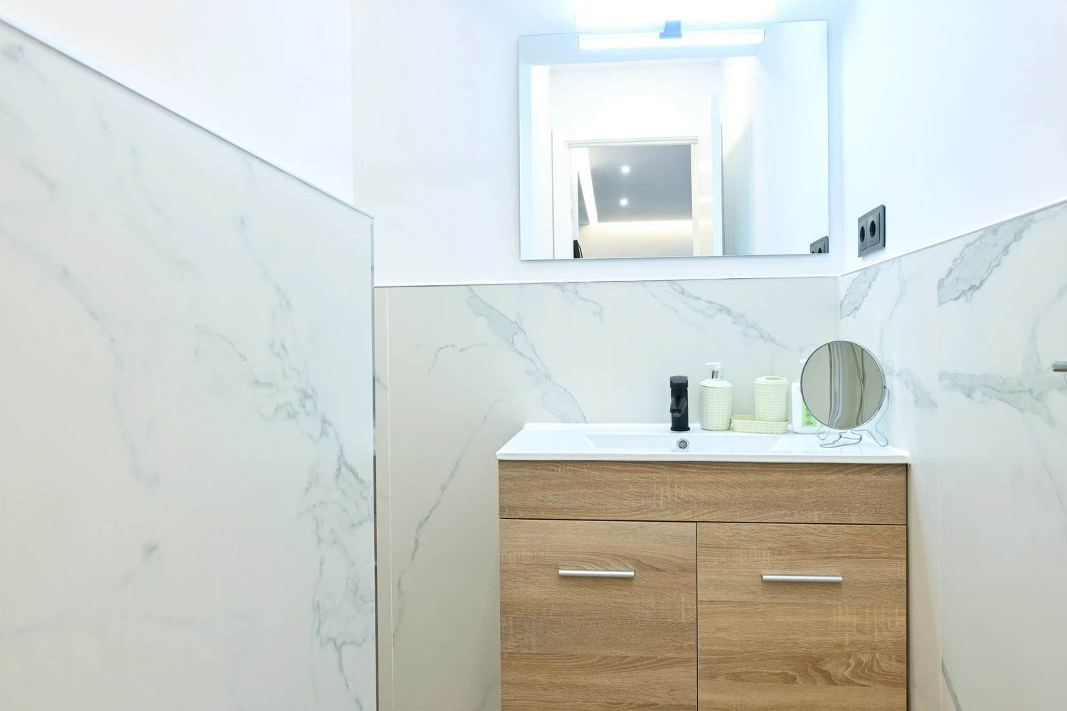 El baño, moderno y funcional, cuenta con un plato de ducha. La disposición del baño asegura fácil acceso desde cualquier parte del apartamento, haciendo que tu estancia sea aún más cómoda y relajante.