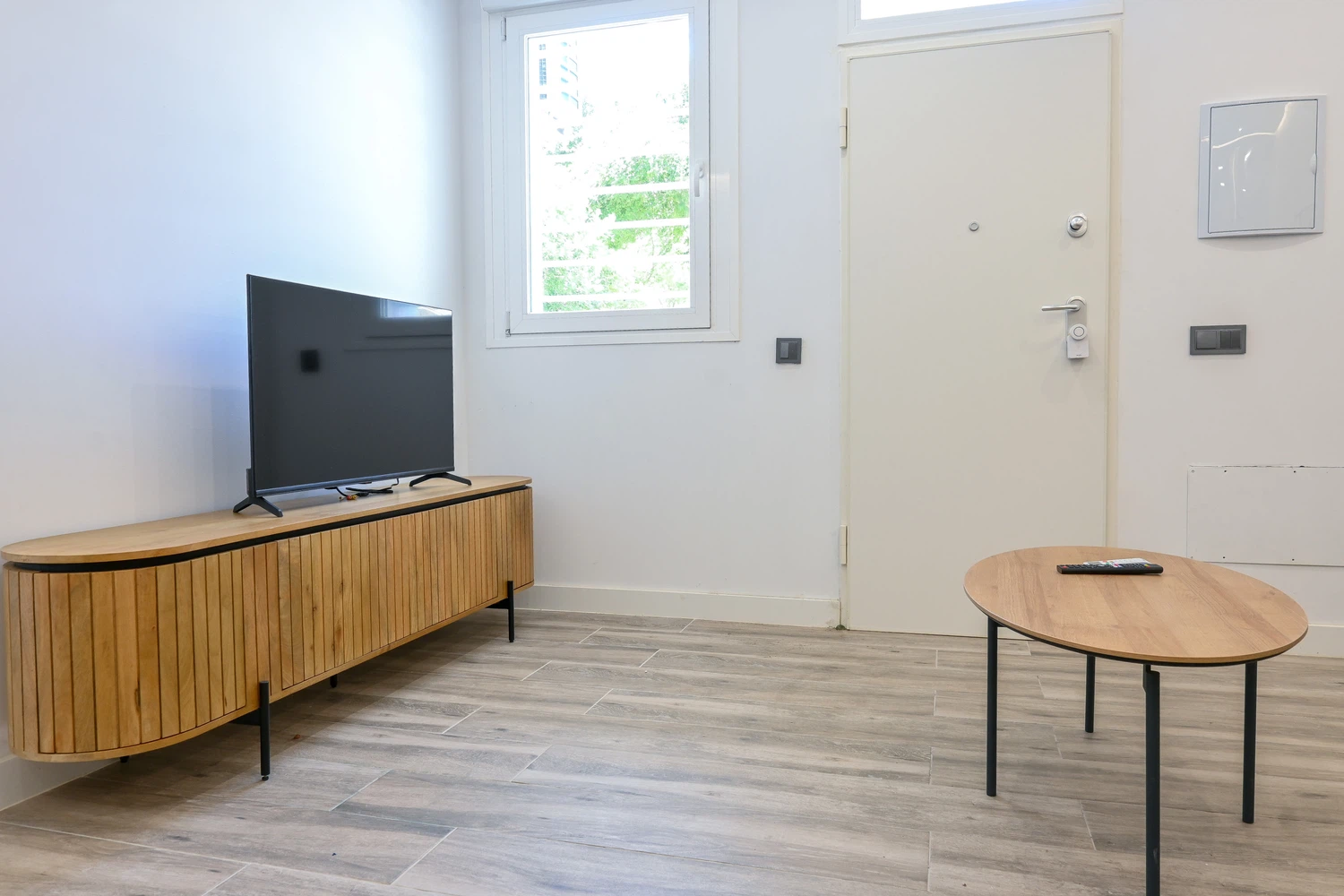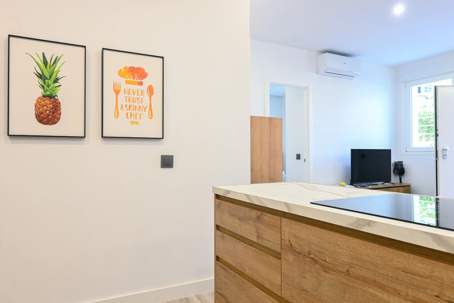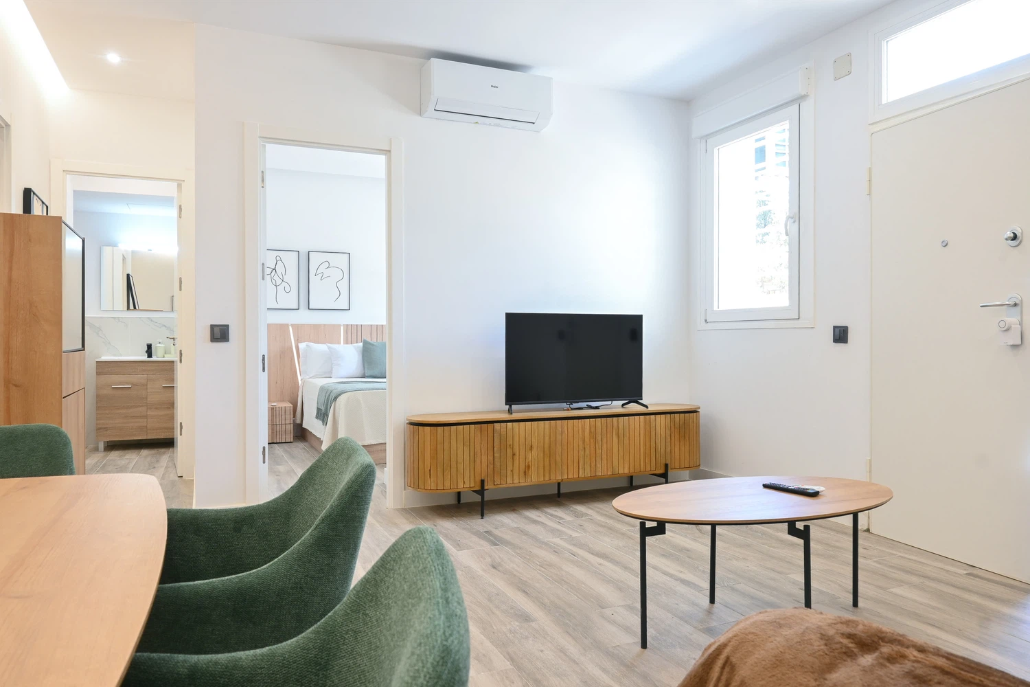 El salón es un espacio luminoso y versátil, diseñado para el máximo confort. Equipado con un sofá cama, es perfecto para alojar huéspedes adicionales. Además, la sala cuenta con una TV de pantalla plana, creando un espacio ideal para relajarse y disfrutar de una noche de películas o simplemente descansar después de un día ajetreado. Los grandes ventanales del salón permiten la entrada de abundante luz natural, creando un ambiente acogedor y agradable.
