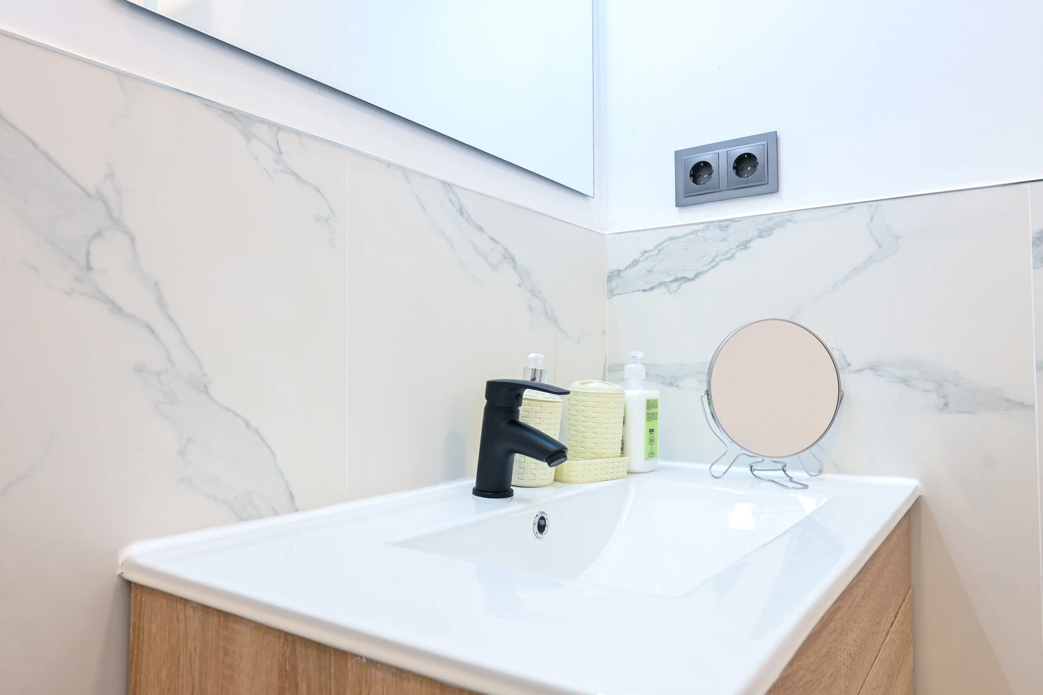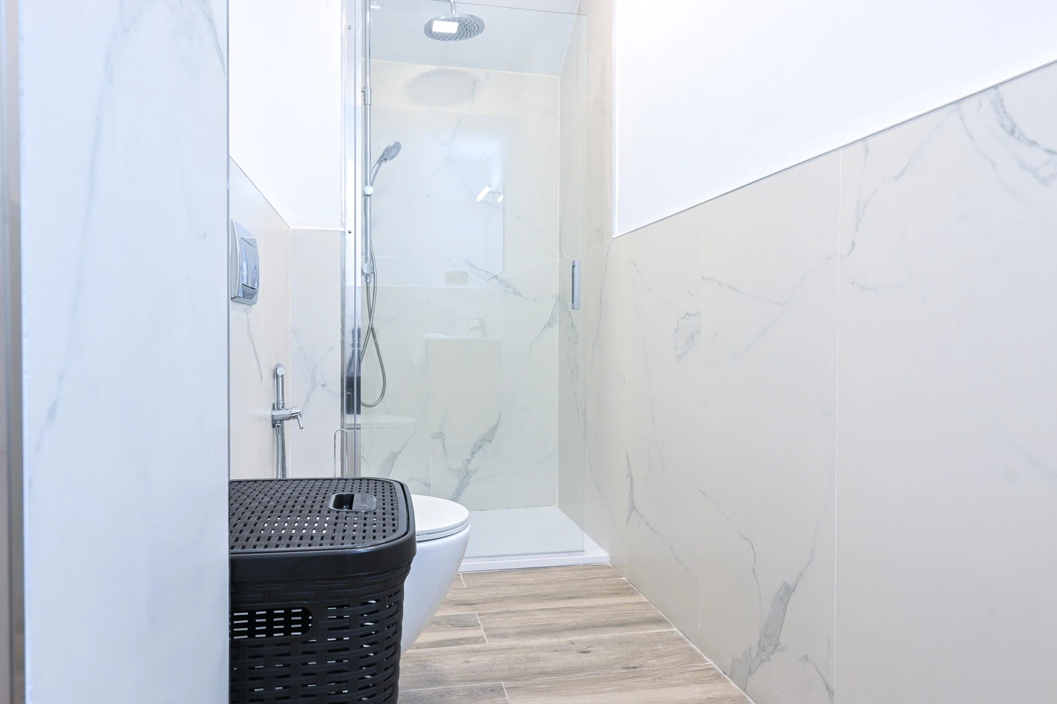 El baño, moderno y funcional, cuenta con un plato de ducha. La disposición del baño asegura fácil acceso desde cualquier parte del apartamento, haciendo que tu estancia sea aún más cómoda y relajante.