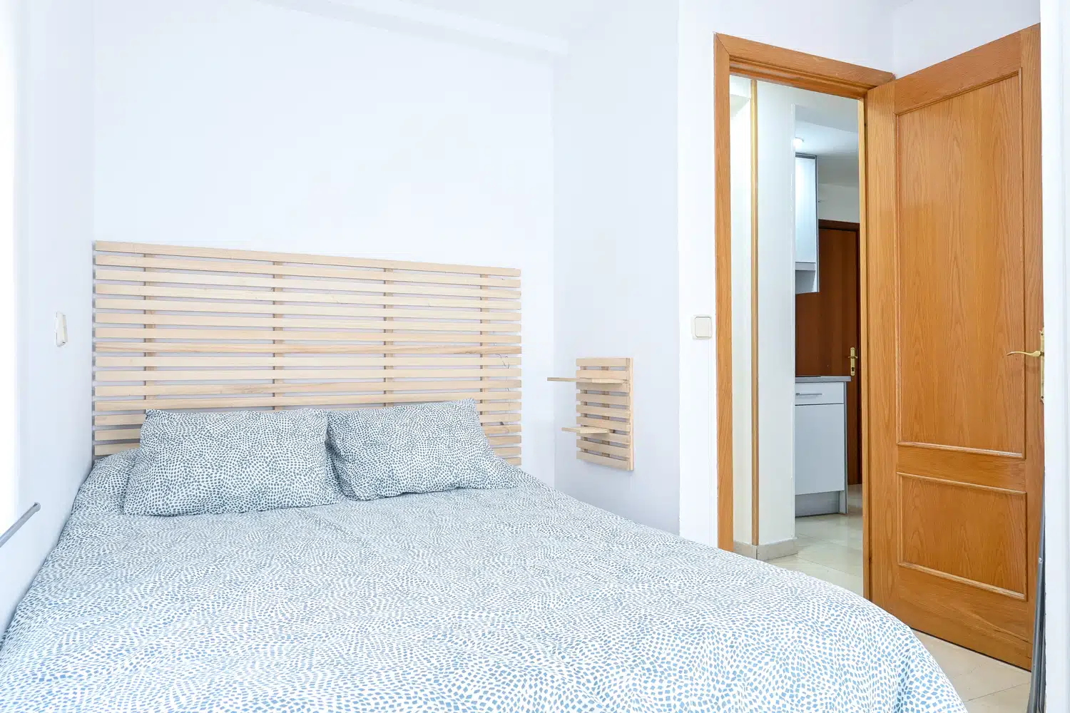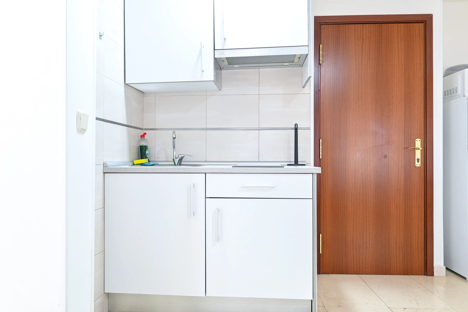 El estudio cuenta con un dormitorio independiente, proporcionando un espacio tranquilo y privado para descansar. Equipado con una cama cómoda y almacenamiento suficiente, es el lugar perfecto.