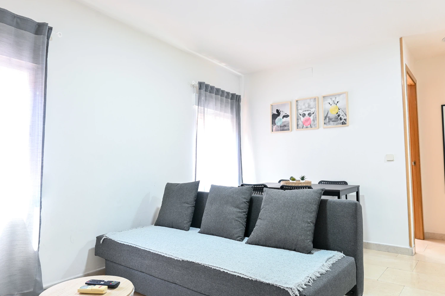 El salón es amplio y acogedor, equipado con un sofá cama cómodo, ideal para alojar a invitados adicionales. La decoración es contemporánea, creando un ambiente cálido y acogedor donde puedes relajarte, leer o ver televisión.