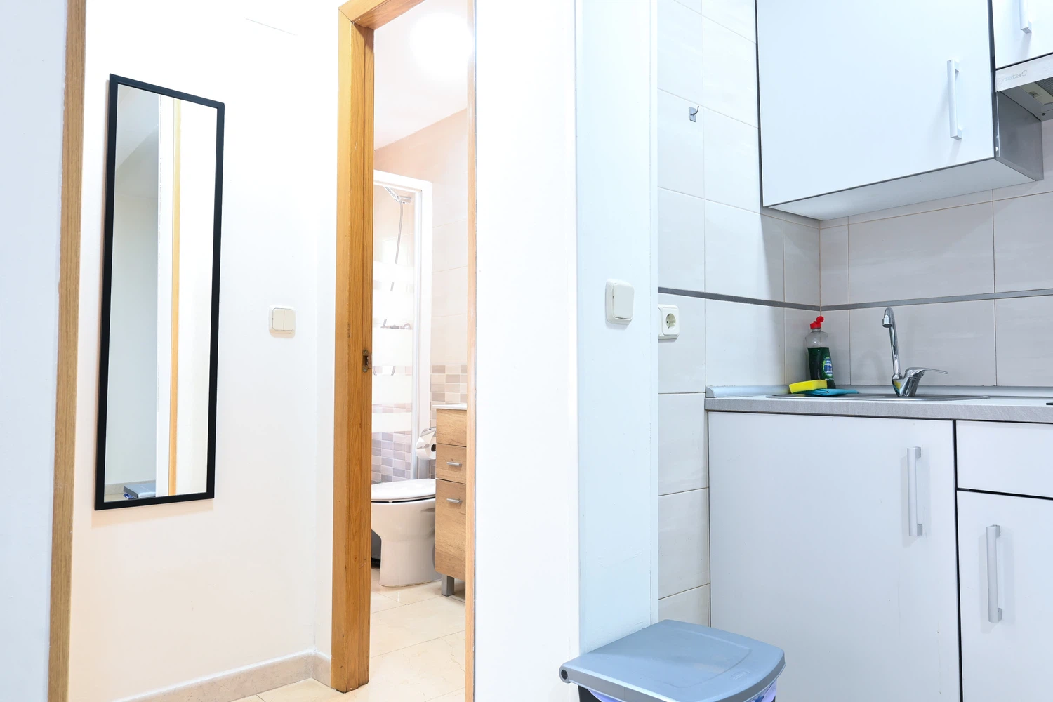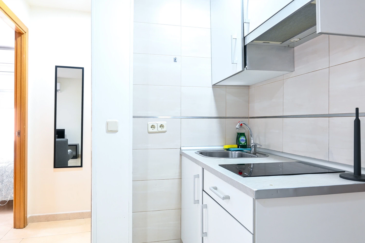 La cocina está integrada en el salón, ofreciendo un espacio práctico y funcional para preparar tus comidas. Totalmente equipada con electrodomésticos, incluye una estufa, horno, microondas, y una nevera. Los armarios proporcionan almacenamiento suficiente para tus necesidades culinarias.