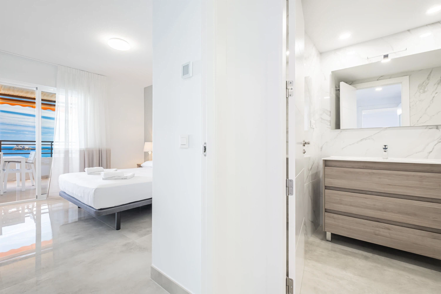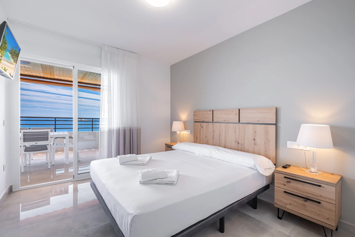 Apartamento reformado con acabados de lujo en primera línea de playa Levante, Benidorm, con acceso directo a la playa desde el establecimiento. Posee 2 dormitorios, 2 cuartos de baño con ducha y capacidad para 5 personas.