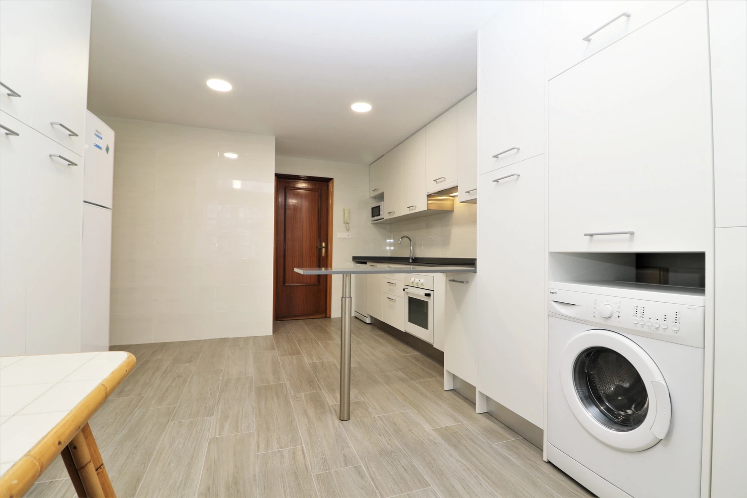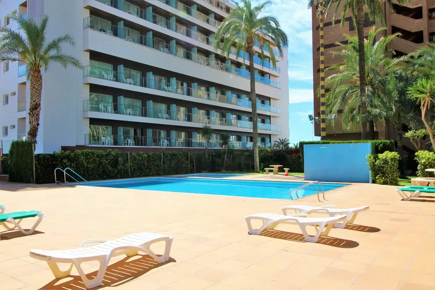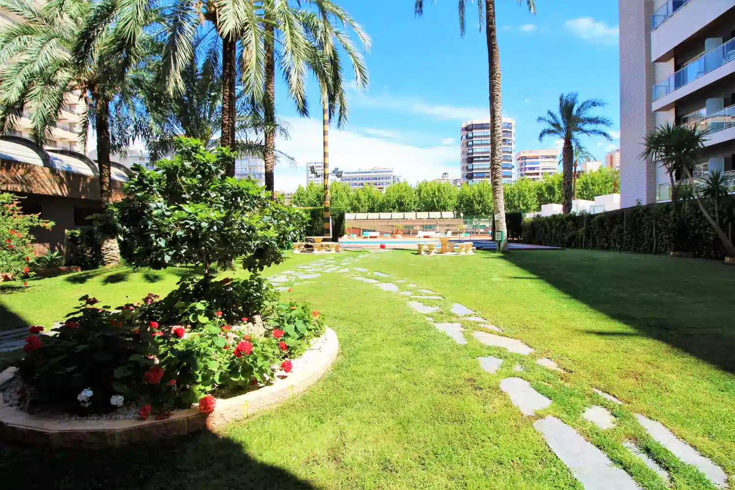 Dispone de ascensor, jardín, mobiliario jardín, parcela vallada, terraza, plancha, secador, calefacción bomba de calor, aire acondicionado, piscina comunitaria+infantil, garaje en mismo edificio, Televisión y WIFI.