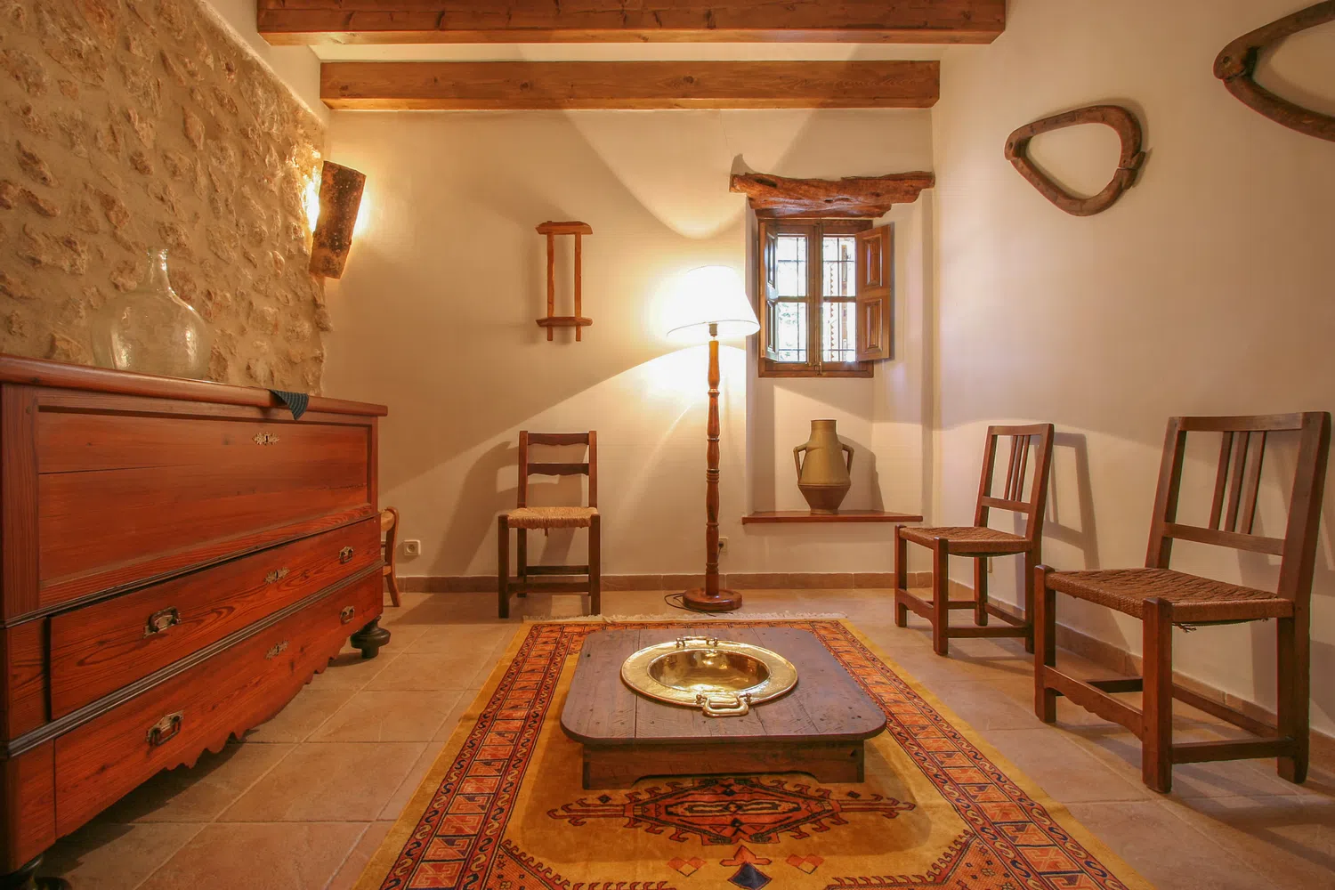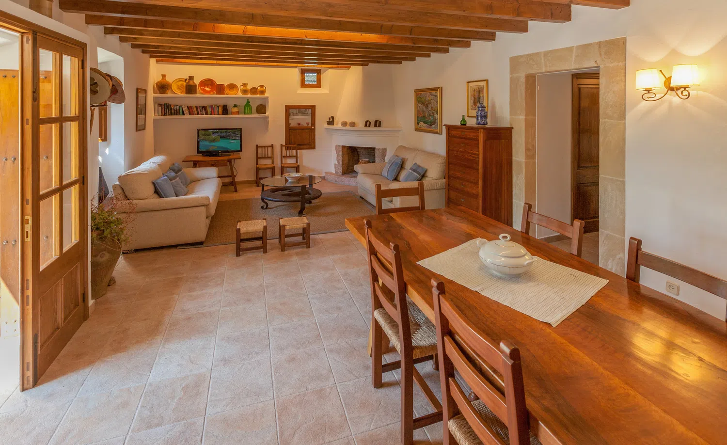 Consta de un amplio salón comedor consta de vigas de madera en el techo, suelos de cerámica y muebles tradicionales, todo ello con el objetivo de hacer la estancia más relajante. La zona del salón es amplia y consta de TV satélite, Wi-Fi y chimenea. En la parte de atrás del salón podemos encontrar otra zona de descanso y un aseo. La cocina está muy bien equipada y tiene una salida al exterior hacia una terraza cubierta y la zona de la piscina.