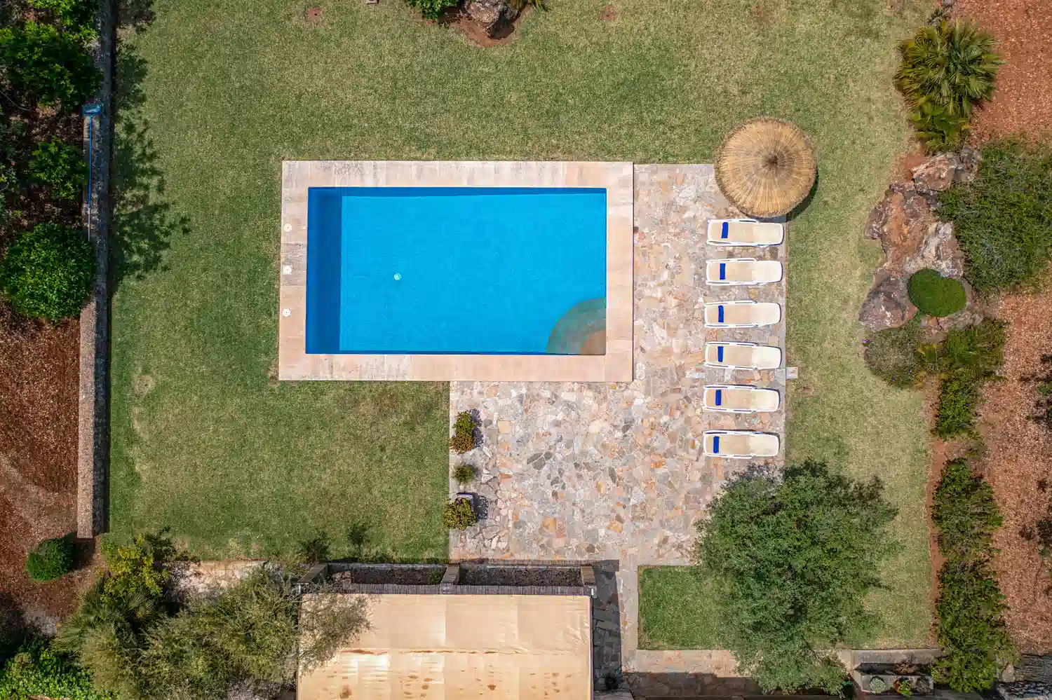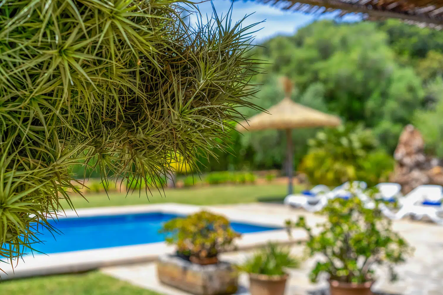 La casa tiene un amplio porche con mobiliario, una bonita zona de barbacoa y amplias terrazas. La piscina (8x4mts) de agua cristalina es de estilo romano y está rodeada de un jardín con césped.