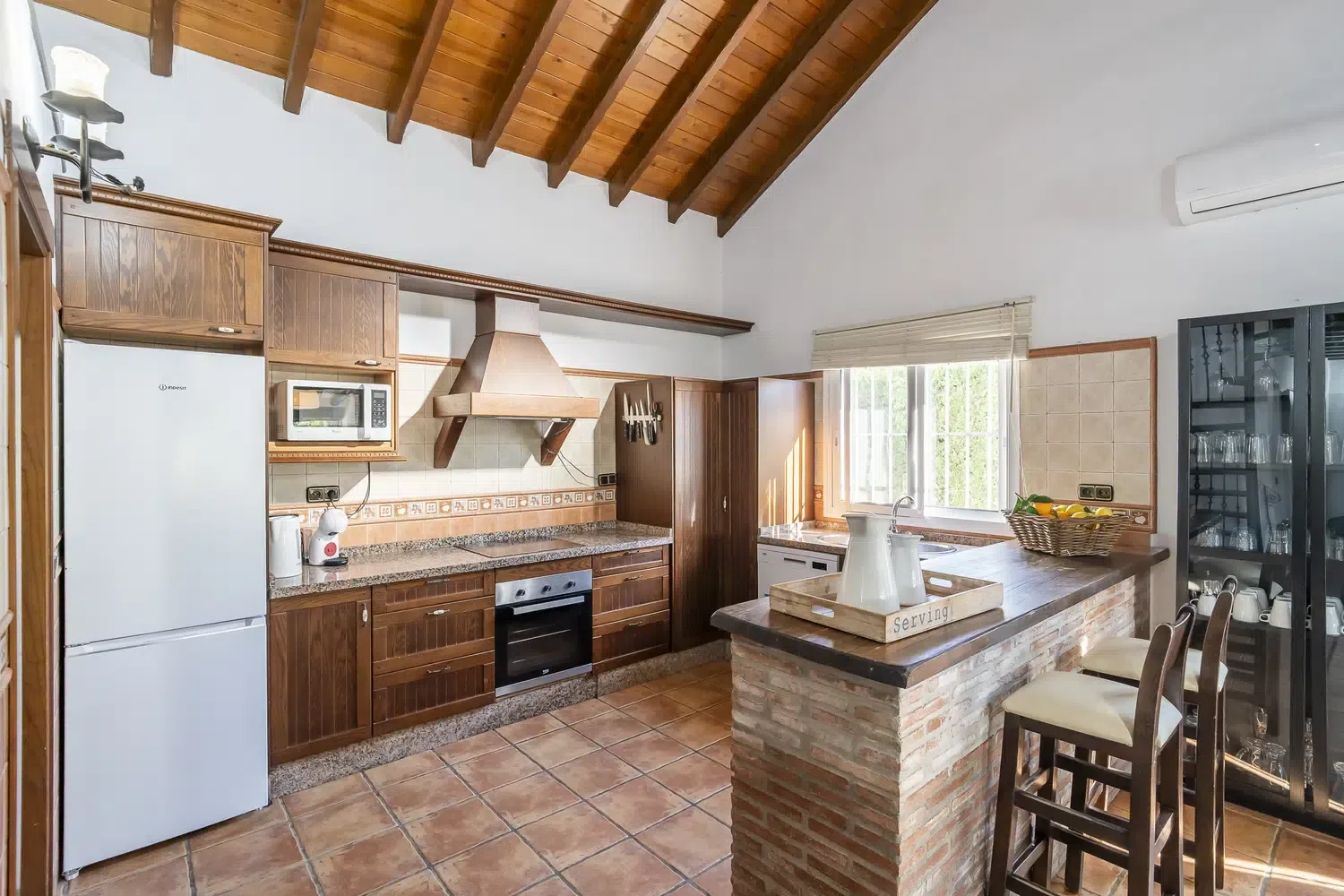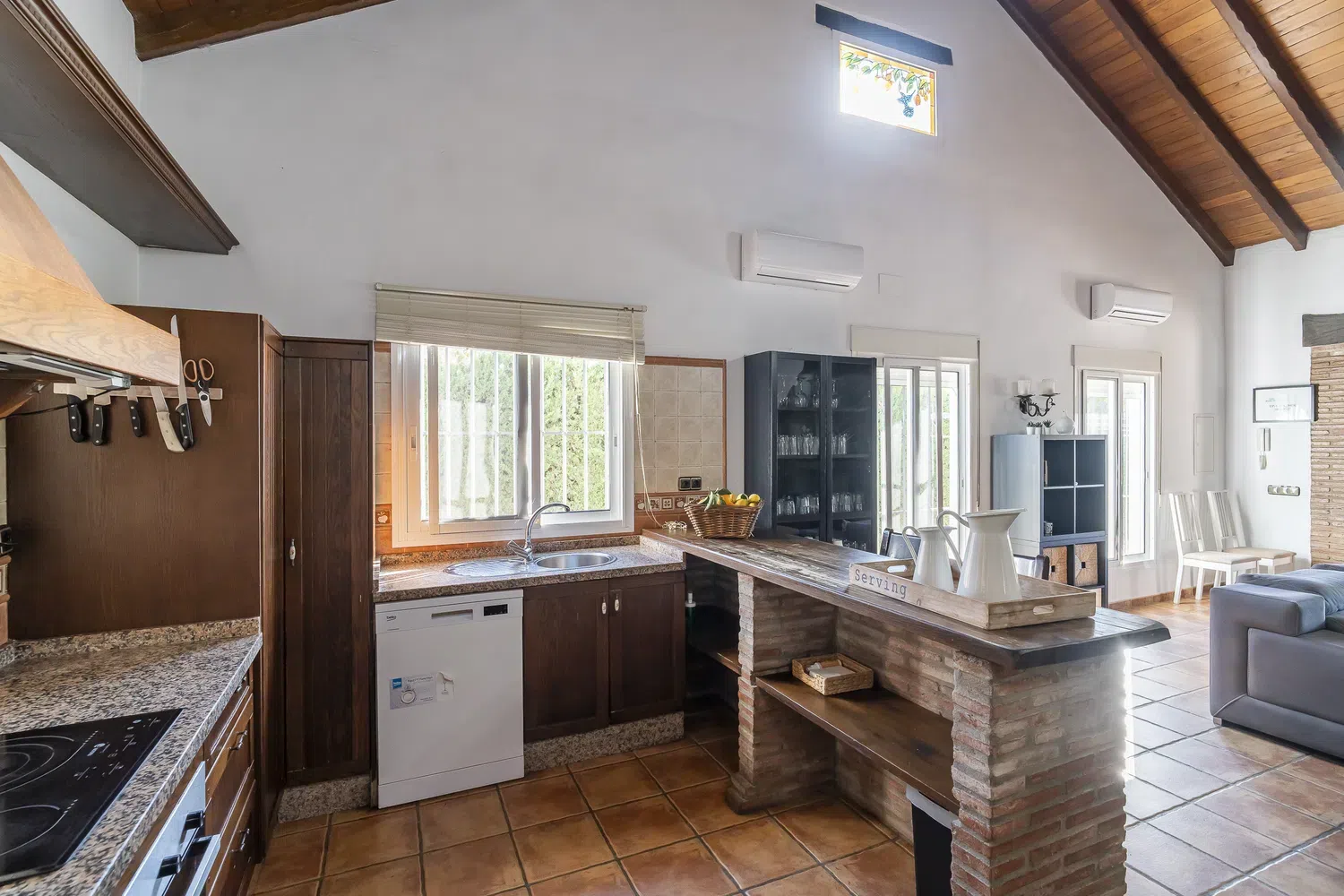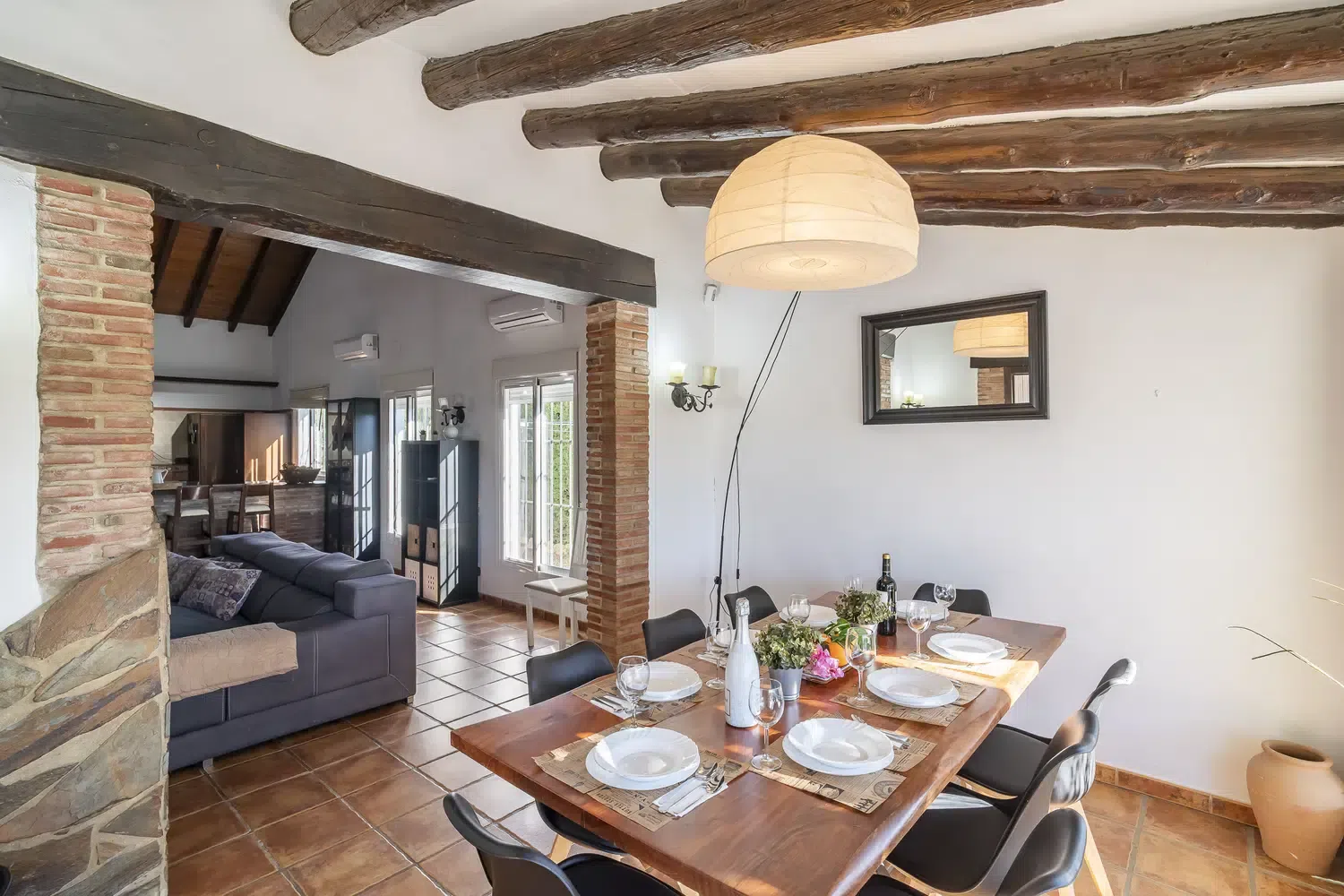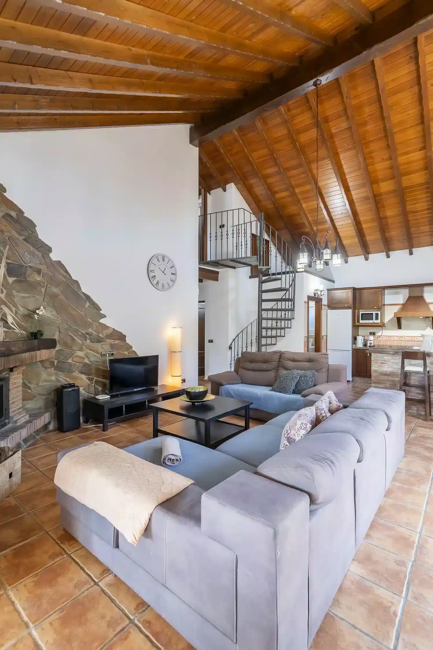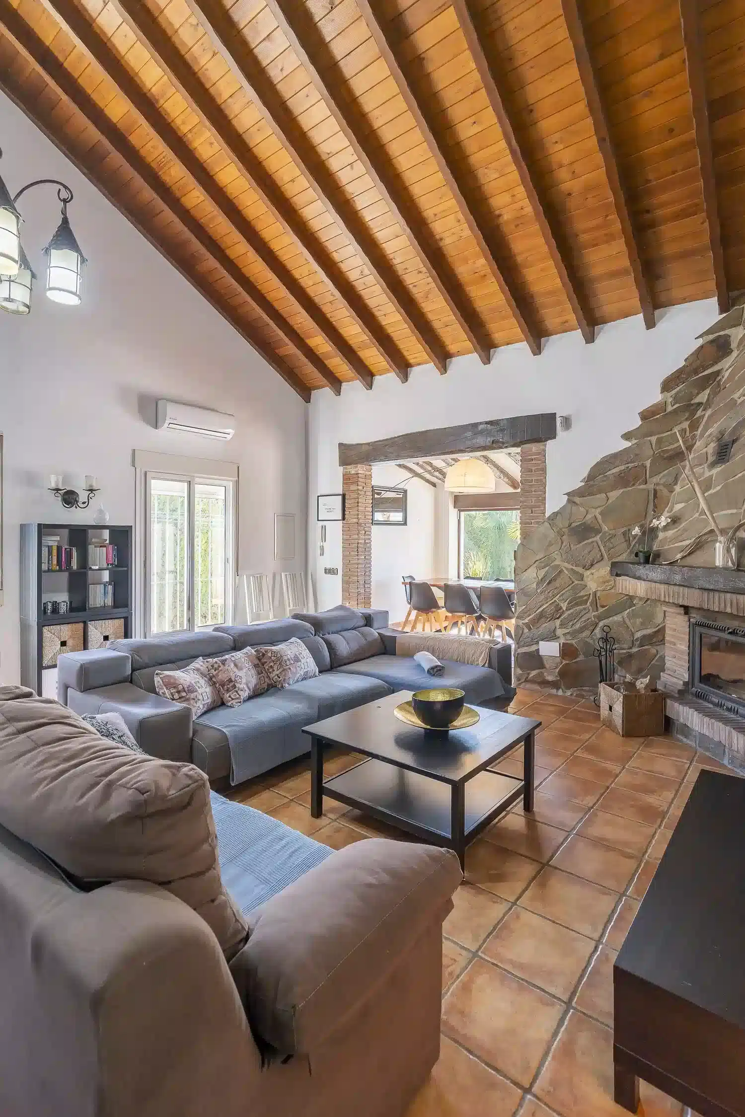 El salón-comedor es un espacio acogedor gracias a sus techos altos y chimenea, perfecto para relajarse tras un día de turismo o playa. La cocina americana está totalmente equipada con electrodomésticos modernos — vitrocerámica, horno, lavavajillas y más — para que prepares tus comidas favoritas con total comodidad. Además, la villa está completamente climatizada y ofrece WiFi gratuito, televisión satélite multilingüe y menaje completo.