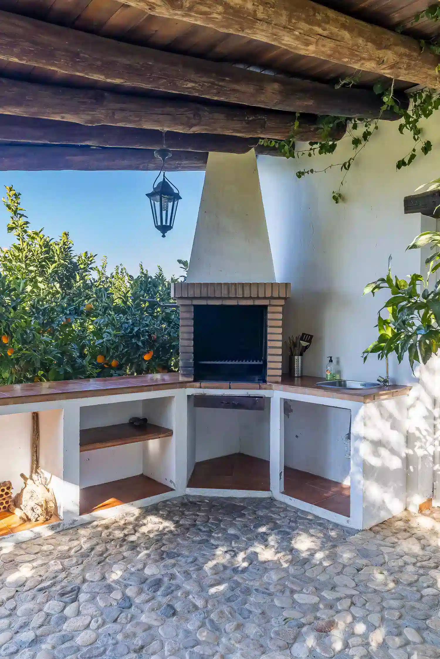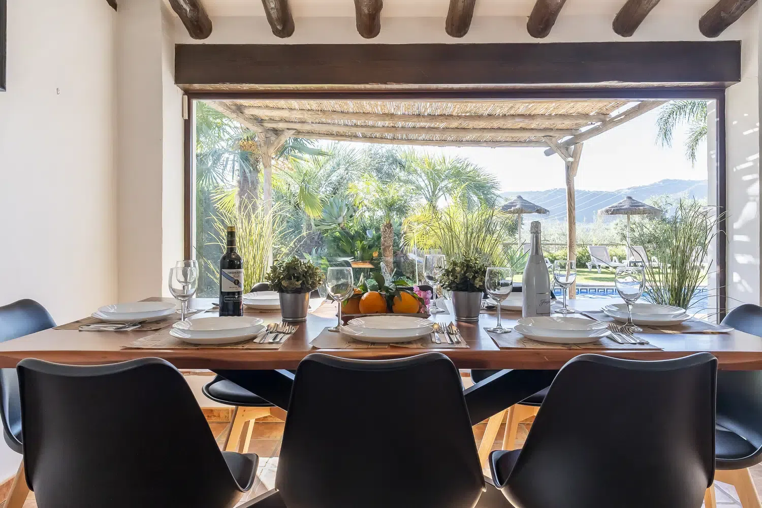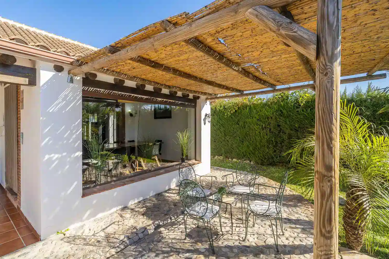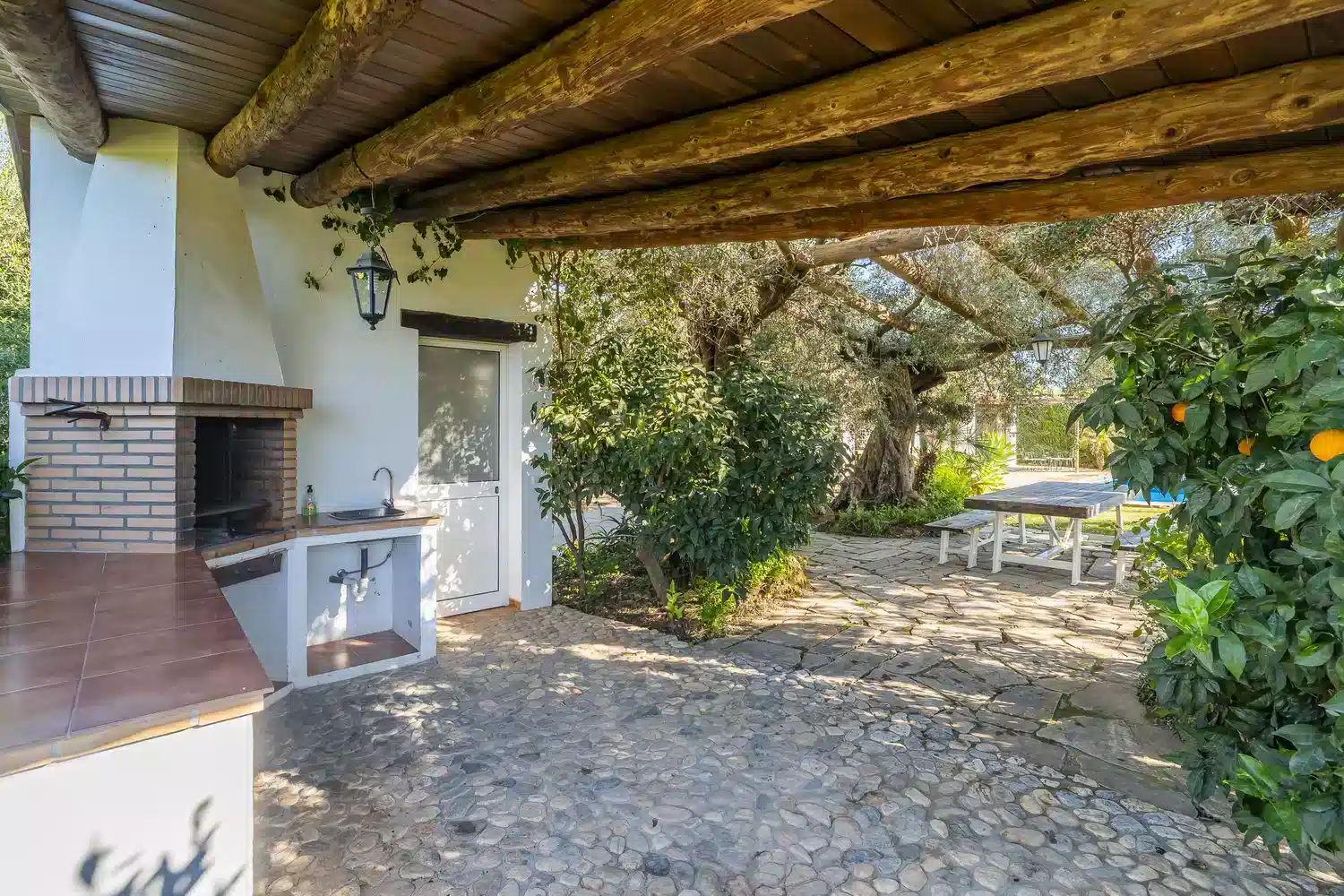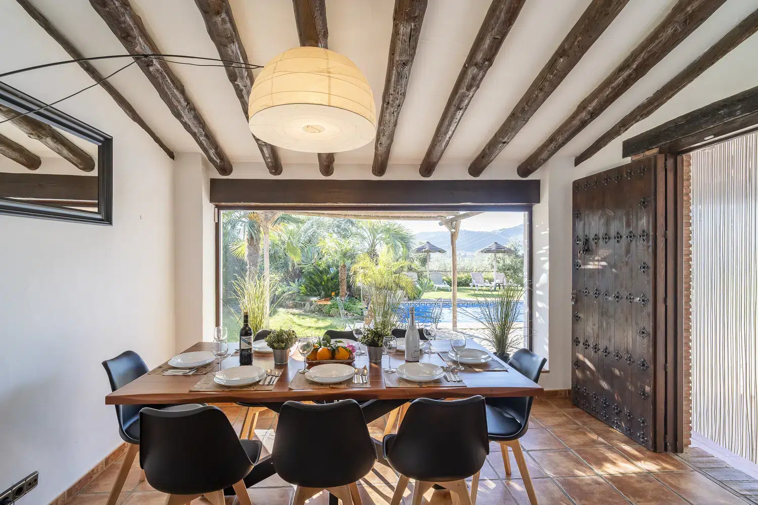 El salón-comedor es un espacio acogedor gracias a sus techos altos y chimenea, perfecto para relajarse tras un día de turismo o playa. La cocina americana está totalmente equipada con electrodomésticos modernos — vitrocerámica, horno, lavavajillas y más — para que prepares tus comidas favoritas con total comodidad. Además, la villa está completamente climatizada y ofrece WiFi gratuito, televisión satélite multilingüe y menaje completo.