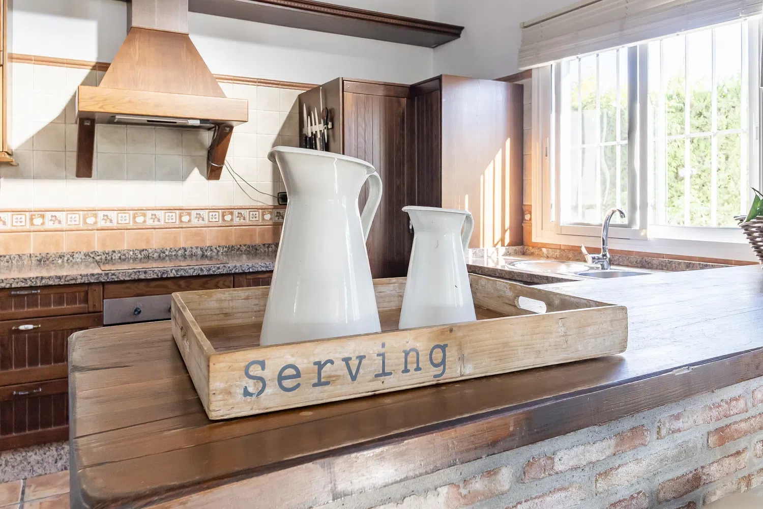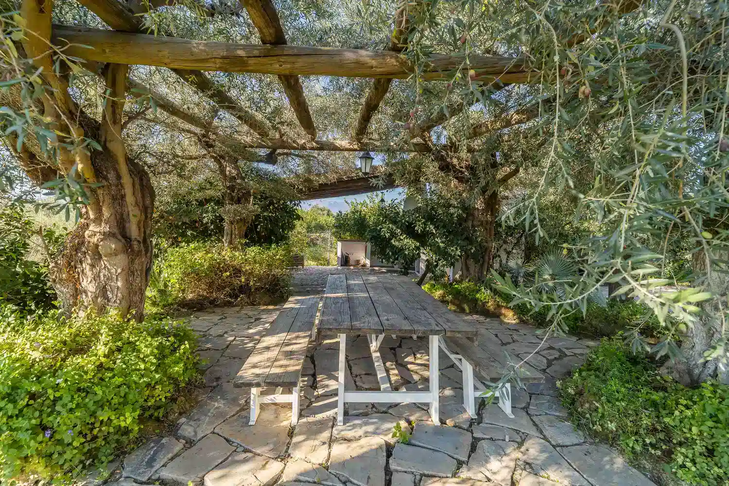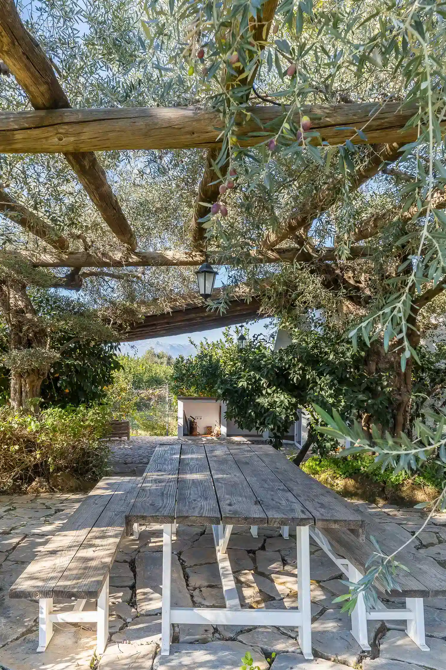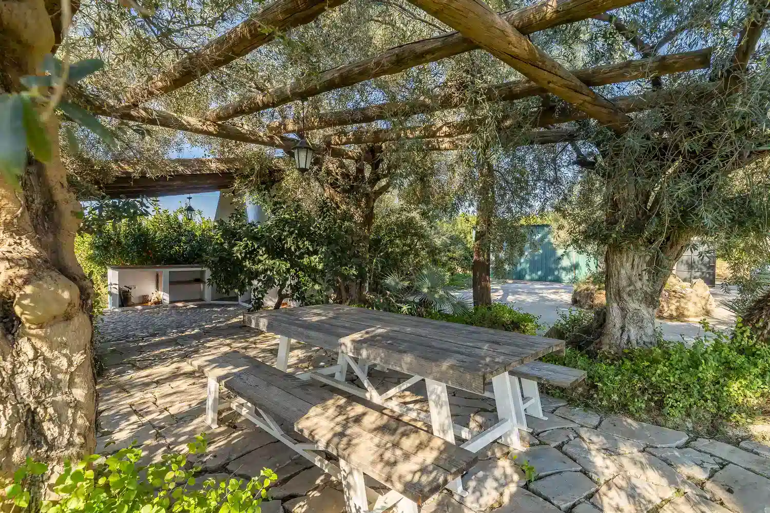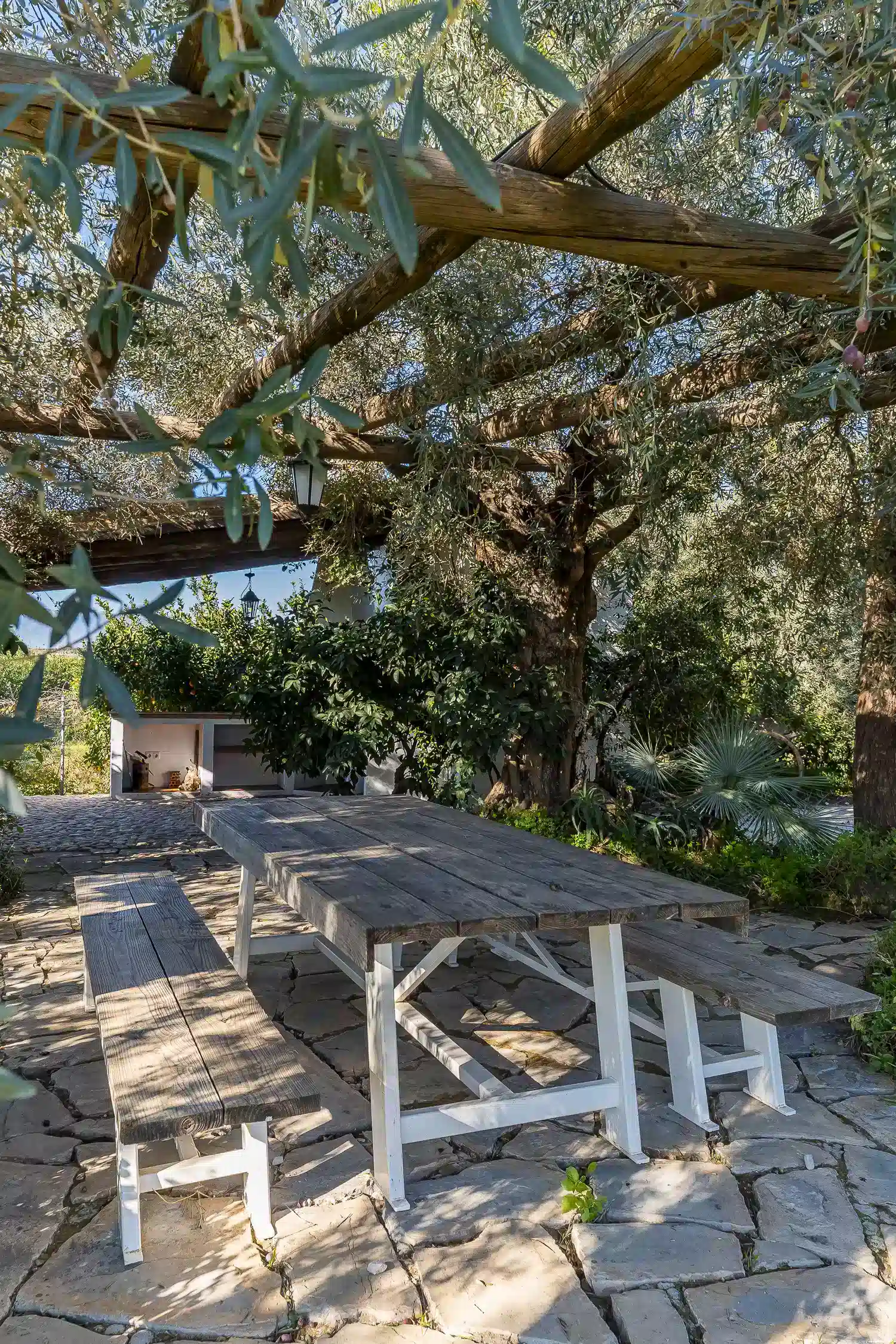 El salón-comedor es un espacio acogedor gracias a sus techos altos y chimenea, perfecto para relajarse tras un día de turismo o playa. La cocina americana está totalmente equipada con electrodomésticos modernos — vitrocerámica, horno, lavavajillas y más — para que prepares tus comidas favoritas con total comodidad. Además, la villa está completamente climatizada y ofrece WiFi gratuito, televisión satélite multilingüe y menaje completo.
