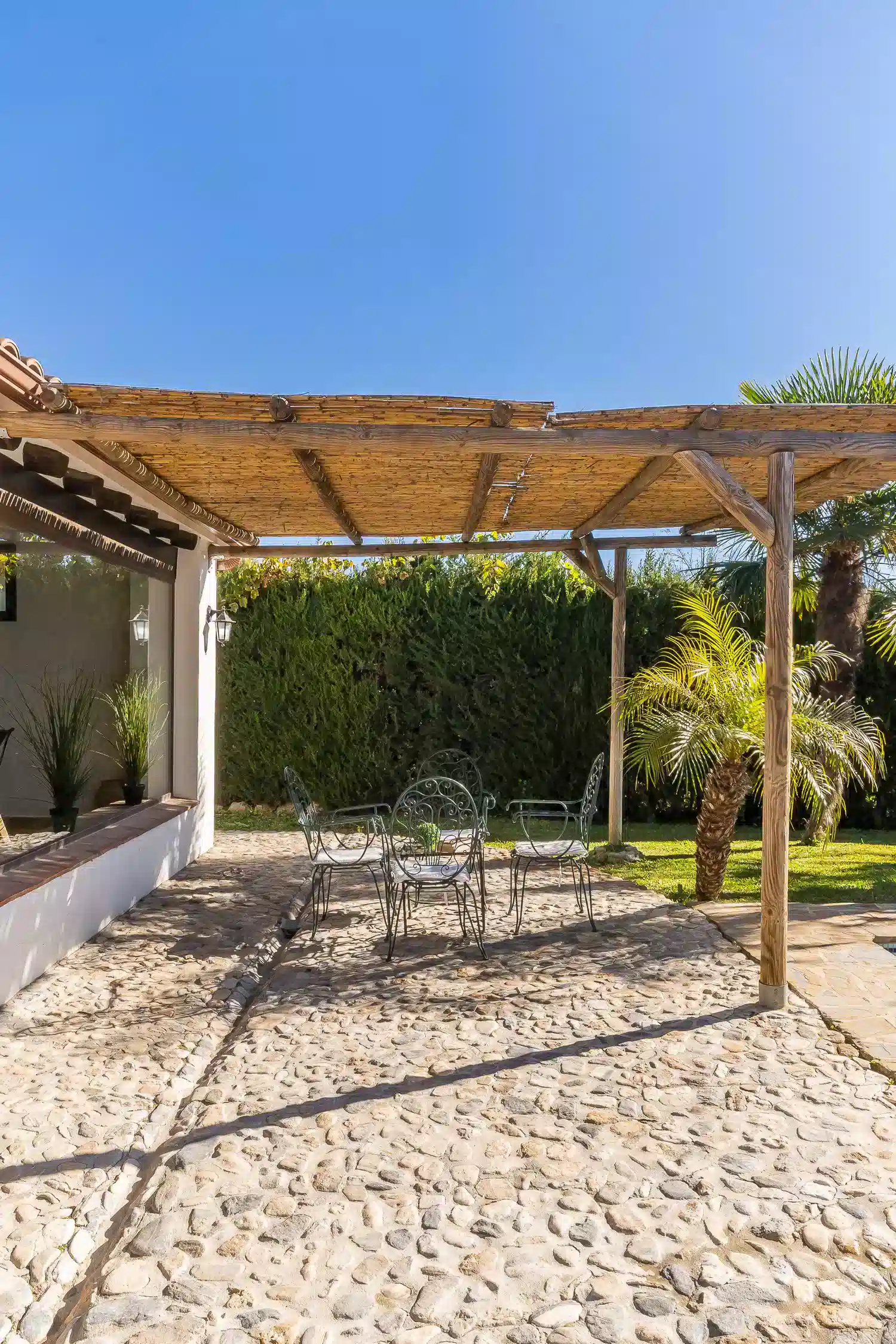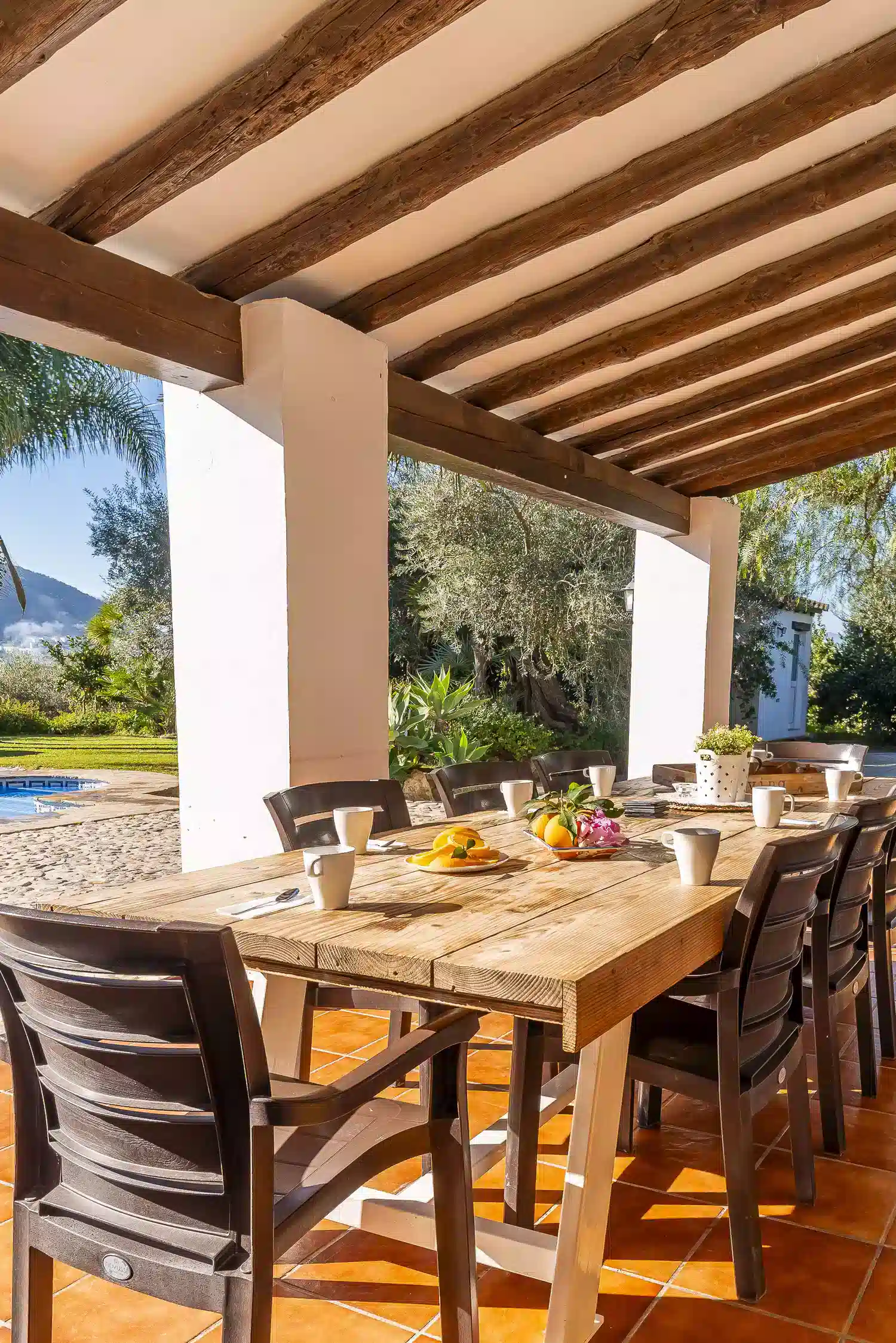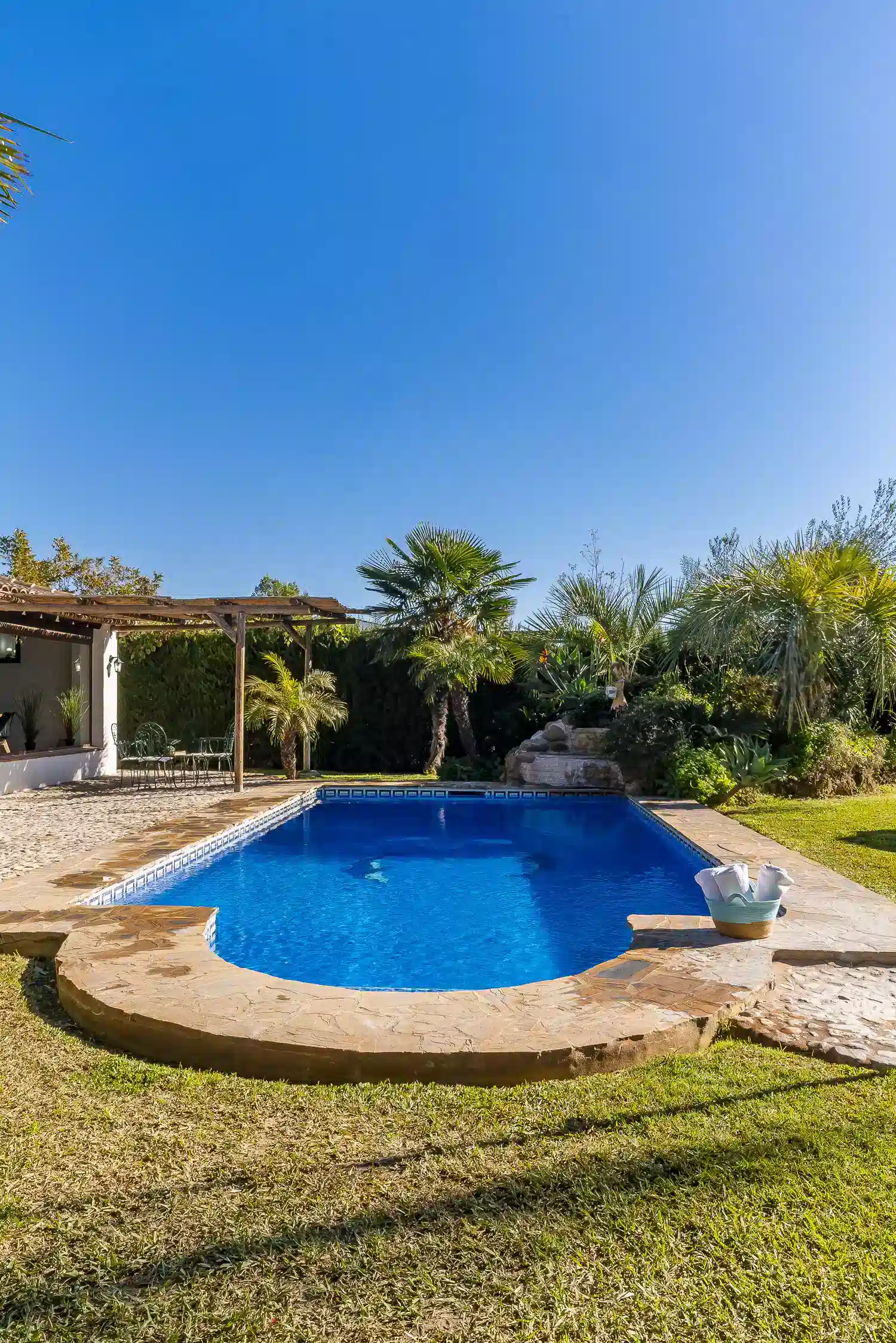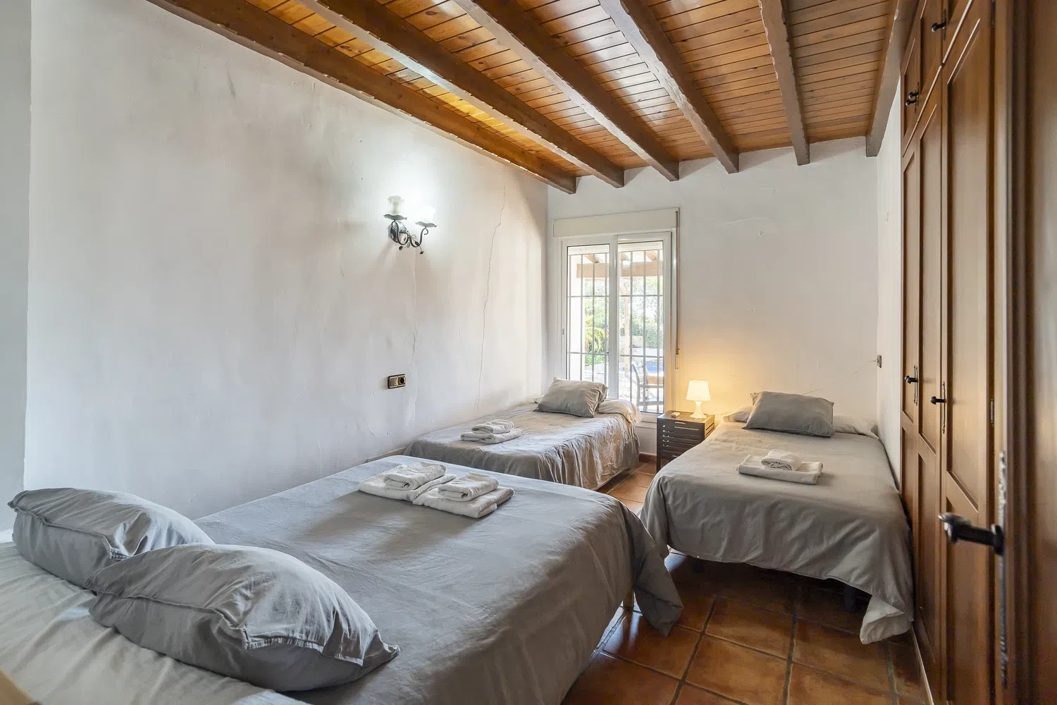 En su interior, la villa ofrece cuatro dormitorios espaciosos: uno con cama de matrimonio y dos camas individuales, dos dormitorios con cama de matrimonio y otro con dos camas individuales. Cuenta con tres baños completos y un aseo adicional, garantizando la máxima comodidad para grupos numerosos.